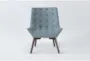 Introducing the Shelly Sea Blue Fabric Tufted Chair with Coffee Legs, a perfect blend of Mid-Century Modern and Modern styles. This chair features a sophisticated scoop design with a button-tufted back and seat, adding a touch of elegance to any room. The tailored piping detail enhances its refined look, making it an ideal accent piece for your living space.