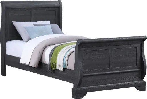The Everton collection will add an enduring and effortless feel to your bedroom spaces. The twin-size sleigh bed features a classic silhouette finished in a versatile charcoal gray color with a replicated wood grain texture, providing an authentic wood feel. Its charming design and time-honored appeal make it a great choice for a range of decorating tastes. Includes headboard, footboard, and rails.