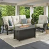 The Eclipse Cushion Seating collection by Mallin is one of our more premium collections featuring a bold design, high-back seating, and ultra-plush cushions in outdoor patio furniture. Each piece in this sofa group has an extruded aluminum frame with cast aluminum accents that have weather-resistant features such as a UV-resistant and premium hand-applied antique finish, protected with a clear topcoat. The fire pit features a slat-top table design with a woven aluminum strap base. The sofa and spring club chairs have a fully welded and aluminum braced frame with a back-slat design and graceful, circular arms. The spring motion in the chairs allows them to rock and bounce lightly. Settle into the ultra-plush, high-back Sunbrella® cushions that are included with this sofa group, set upon PVC sling seat suspension, and relax in comfort.
