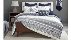 Transform you bedroom with the charming shabby chic allure of the Mila Comforter Set. The cotton comforter flaunts an updated navy botanic print, on a natural white ground, with tufted white chenille, in a chevron design, to create a charming farmhouse look. A solid navy reverse complements the top of the comforter, while hidden bartacking secures the hypoallergenic polyester filling without visible line for a clean finish. Two matching shams beautifully mimic the design of the comforter, completing the farmhouse comforter set. Machine washable, this cotton tufted comforter set offers soft comfort and a vivid touch that elevates your bedroom decor.