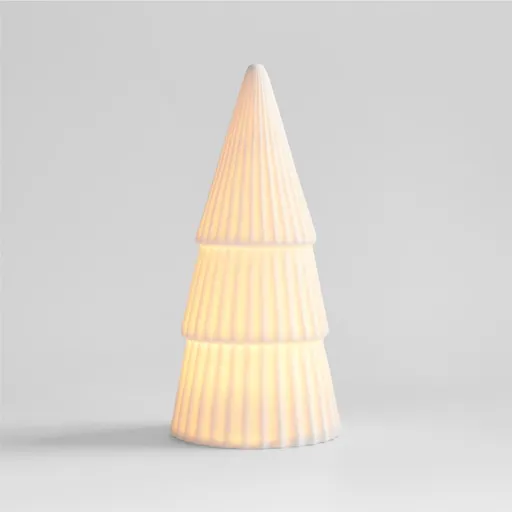 Coziness meets modern minimalism in our illuminated tree. Fluted to create shadow-enhancing dimension, the snow-white porcelain diffuses light from its integrated LED in an intriguing glow at once soft and linear. Create a sculptural and striking forest for a wintry mantel or holiday table by clustering this medium tiered evergreen with its smaller and larger counterparts or mixing and matching with our other exclusive decorative trees.
