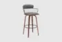 Experience modern comfort and style with the Priscilla 30" Swivel Walnut Wood Barstool in Grey Faux Leather with Golden Bronze Metal. This barstool features a contemporary design that will enhance any dining room or kitchen space. Enjoy the convenience of its swivel function and the support of its high backrest.