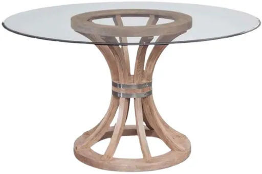 The Sheffield Dining Table features a contemporary silhouette. The rustic wire-brushed finished wood pedestal base is artfully paired with a bronze finished metal belt around the middle. Features a 54" round, clear glass top, completed with a beveled edge. Comfortably seats 4 people.