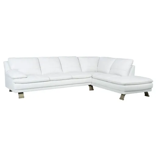Whether you're relaxing for a night in or stretching out to get some much needed sleep, you'll love the Rio White II Leather Corner Sofa w/Right Chaise. Made with 100 percent leather where the body touches, this classy sofa features deep, wide seating for extra comfort. Its chrome metal legs, baseball stitching and saddle arm style give it a style and sophistication you'll love for your space.