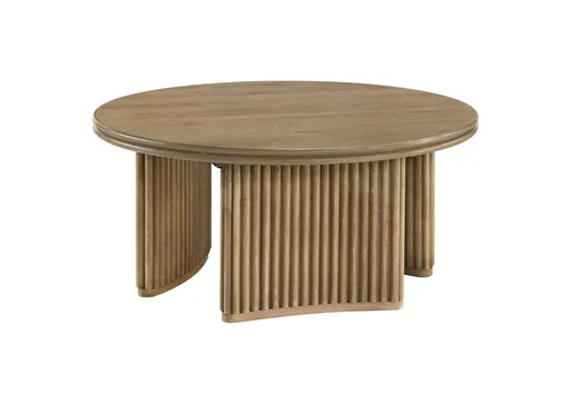 Merging rounded form with vertical rhythm, this round coffee table is a sculptural focal point for the living room. Its circular top is balanced by a curved pedestal base adorned with reeded detailing, all in a distressed light brown finish. Constructed from engineered wood and oak veneer, this table combines organic materials and bold geometry for everyday use or elevated gatherings.