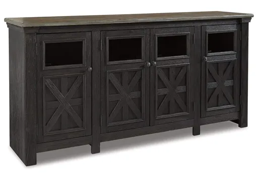 Shabby chic with a hint of down-home country, the Tyler Creek TV stand appeals to today’s more relaxed sensibilities. Its richly rustic two-tone effect blends a textured black finish with a weathered gray-brown top for an easy-elegant aesthetic. Framed doors with crossbuck detailing and clear glass insets bring a touch of modern farmhouse to the scene.