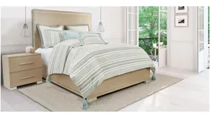 Create an atmosphere of tranquility with the Max 7-pc. Queen Duvet Set! This beautiful design is all about relaxation and comfort with cool, soothing tones. The eye-catching stripe design is achieved with woven jacquard that adds a small raised detail for ultimate texture and depth. The pattern is balanced by solid accents in ivory, aqua and gray, and the stylish flange borders on the shams and pillows add a charming flair to the whole look. The decorative pillows also have polyester fill and removable covers for ultimate convenience. The cotton-backed duvet is finished with a hidden button closure to secure a comforter insert (NOT included) within the duvet cover. Included is 1 duvet, 2 standard shams, 2 euro shams and 2 decorative pillow that are feather filled.