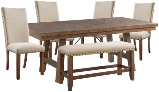 The Jax dining collection makes rustic entertaining easy. Its cherry finish and earthy wood grain detail create an organic look. Flared legs, turnbuckle metal accents, and upholstered seating add a contemporary flavor to his charming set. Make room for more family and friends with its 18” leaf, extending this table to 78” long.