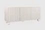 Introducing the Tay Scallop Motif Taupe Wood 3 Door 74" Sideboard Buffet. This modern piece adds a touch of sophistication to your dining room or kitchen with its unique scallop design and neutral taupe color. Made from durable rubberwood, the sideboard offers ample storage space with its three doors and adjustable shelves.
