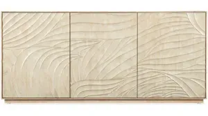 Retreat Center has a striking carved wave motif on the door fronts. Crafted of Oak Veneers and Resin, the case is finished in the sand-colored Dune finish, while the door fronts have a lighter contrasting finish. The entertainment center features three doors with soft-close hinges and touch-latches, two adjustable shelves behind the left door, two adjustable shelves behind the pair of right-side doors, a ventilated back panel and a three-plug electrical outlet located behind the pair of right doors.