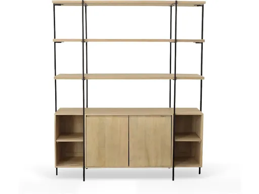 The Elena sideboard and hutch has black metal framing with two top wood open shelves and a wood bottom cabinet with interior open and closed shelving.