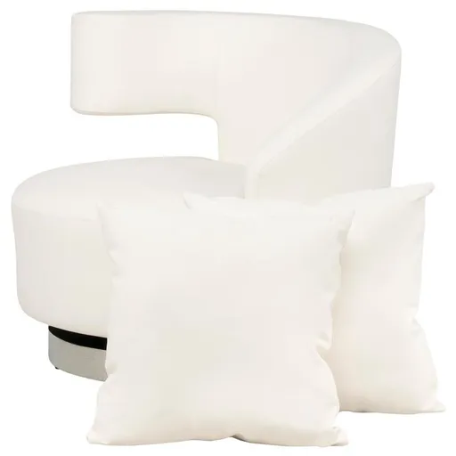 The Okru III White Accent Chair w/2 Pillows is the perfect addition to your entertaining space. Made of leatherette and featuring a stainless steel base, this attractive swivel chair boasts a barrel back style, curved design and modern appeal. Its deep, wide seating is made even more comfortable by its two matching pillows.