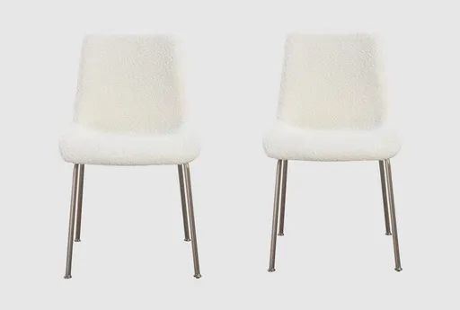 Enhance your dining experience with the Crissie Upholstered Dining Chair set, featuring a modern design in cottage cheese boucle and brushed nickel metal. These chairs combine contemporary style with ergonomic design for engineered comfort and enhanced stability.