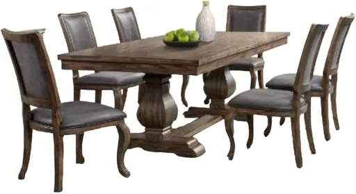 A traditional design gets a contemporary update with the Gramercy Dining collection. This table will bring sophistication and comfort to your dining space. The dining table features a distinctive weathered brown finish with slight distressing, two 12 inch extensions, and a trestle base design for a casual country flair.