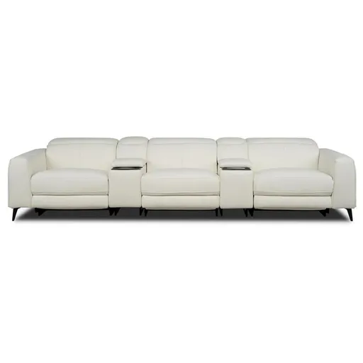 Love movies but don't get out to the theater often? Bring the cinema experience to you with the Luke 2.0 White Home Theater Leather Seating w/2PWR. Made with 100 percent top grain leather where the body touches, this gorgeous couch features power motion, built-in USB-A ports, and two storage consoles with beverage holders.