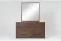 Handsome and hardworking, our Sawyer dresser/mirror brings the spirit of contemporary American design to your space. Every element has been devised and developed by Living Spaces with thoughtful intention, including materials and details that provide natural beauty, durability and functionality. Solid hardwood and cathedral walnut veneer are decked in a rich, warm finish that adds depth, while removable distressed faux vegan leather drawer linings and steel hardware lend texture and character. A jewelry tray is a convenient addition for organization.