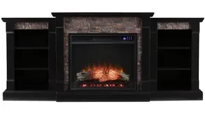 Set your heart aflame with this lodge-inspired Harrow Fireplace. Bookcase storage shelves media, novels, or trinkets. Satin black melds with simulated black river stone for a rustic touch on this traditional fireplace silhouette. Glowing faux fire logs add ambiance with flickering LED flames and lifelike embers, with or without heat. Low profile and wide scale, this electric fireplace with bookcases turns on chic stylebeneath your wall mounted TV in the living room or as a sleek buffet in the dining room.