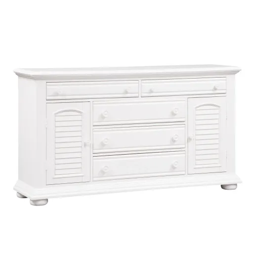 Obtain a fashionable cottage look with this 2 door 5 drawer dresser. The oyster white finish is accented by louvered panels and wooden knob hardware. Storage abounds with the 3 large fully stained drawers, 2 smaller flip down top drawers, and the adjustable shelf located behind each louvered door.
