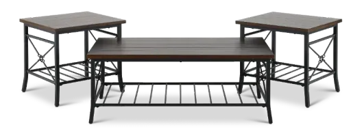 Transform your living room with the Mica collection three-piece table group. This table set comes with two end tables and a matching rectangular coffee table. The metal base contrasts nicely with the warm, dark brown tops to create harmony in your living room. Tie your room together with great new tables from the Mica collection today! Set includes one coffee table and two end tables.