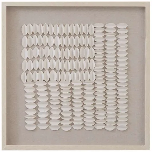 The Baguio wall art features a neutral organic style with folded rice paper pieces arranged in both vertical and horizontal patterns, creating a dynamic, geometric design. The soft linen background enhances the piece with a natural texture, while the off-white frame adds a subtle and refined touch.