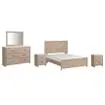 Includes queen panel bed (headboard, footboard and rails), 6-drawer dresser with mirror, and two 2-drawer nightstands Made of engineered wood and decorative laminate Dry, light finish with replicated oak grain and authentic touch Dresser and nightstand with replicated Calcutta marble top Mirror attaches to back of dresser Mattress and foundation/box spring required, sold separately Safety is a top priority, clothing storage units are designed to meet the most current standard for stability, ASTM F 2057 (ASTM International) Drawers extend out to accommodate maximum access to drawer interior while maintaining safety Assembly required