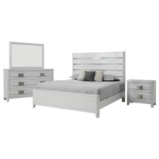 The Contour White 4-Piece King Bedroom Set allows you to modernize the design of your master bedroom. The bed has a gorgeous silver white tone with solid rubberwood construction complete with oak veneers to create a distressed appeal while a spotlight can be found on the headboard to brighten your room with LED lighting. The nightstand and dresser focus on your storage needs with a total of eight drawers while the drawer fronts' undulating panel design and brushed metal accents emphasize the contemporary style of this bedroom set. The mirror balances the design with its mirrored glass and wooden frame construction.