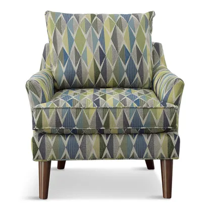 A classic mid century modern design in refreshing teal or sunflower chenille fabric, accented with colorful geometric pillows. This sofa group is scaled for smaller spaces and has tufted tight backs flared arms, and a distinctive wood base that adds to the vintage feel. 5 layer reversible cushions provide long lasting comfort.