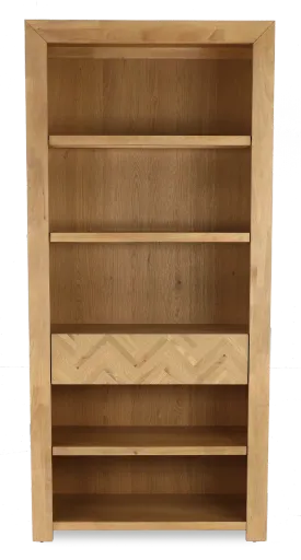 Check out the stylish and practical bookcase from the Geneva Collection! It's the perfect addition to your living room or home office. With a parquet front drawer with ball-bearing glides, two adjustable wood-framed glass shelves, and two fixed shelves, this bookcase offers plenty of storage space for all your books, family photos, and family seasonal decor. Easily use this bookcase on its own, or pair it with our Geneva TV Stand to create a classic entertainment center that is built to last for years to come. It's a must-have furniture piece that will add a touch of elegance and functionality to your living space.
