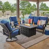 Get lost in the oversized comfort and structurally sound furniture of our exclusive Fairmont Collection. Feel the cool touch of the handmade aluminum frame, featuring a multi-step powder-coated and oven-baked clear coat finish. Each piece in this 4 piece swivel sofa group with a fire pit is constructed by laser welding to create fully welded and braced frames with zero weld marks. The sofa and swivel club rockers feature PVC sling seat suspenion and include oversized deluxe Sunbrella® acrylic cushions. The textilene material's flexibility and sturdiness make it a comfortable material for seating.