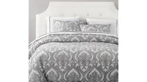 Revel in Nicole's exquisite damask, a luxuriously modern rendition of a traditional woven design. Cool gray tones are woven into an oversized damask pattern, while delicate eyelash contours bring a soft, chic touch. Layer with Nicole Euro Shams and white linen sheets to complete a romantic traditional-style bedroom. Additional texture can also be brought to the set by layering with our Pebble Creek throw blankets and linen pillows.