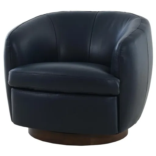Add dimension to your neutral walls with the Leyla Blue Accent Chair. Exclusively part of our Carlo Perazzi collection, this modern piece is upholstered in 100% genuine thick top grain leather. Its curved design and deep, wide seating feature channel tufted accents that prioritize comfort while its 360-degree round wooden swivel makes this piece an instant conversation starter.
