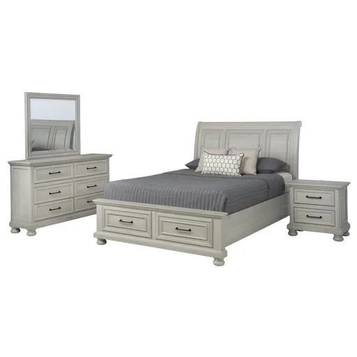 Consider your bedroom decor complete with the Arcadia Gray 5-Piece Queen Bedroom Set. This wooden set features plenty of storage, including a bed with two drawers; a nightstand with two drawers; a dresser with six drawers; and a dresser mirror. Its lovely gray color and distressed pattern add style to this set's attractive modern farmhouse look.