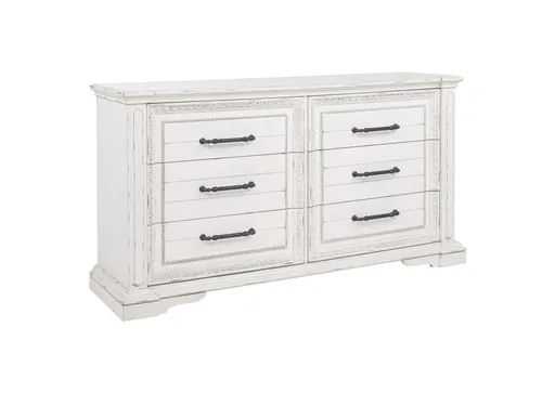 Classic and composed, this six-drawer dresser blends traditional design with elegant practicality. Its vintage white finish is gently distressed, accentuating ornate trim and antique bronze drawer pulls. A hidden jewelry tray tucked into the bottom drawer adds a thoughtful touch, while spacious drawers offer smooth functionality. Crafted from poplar and engineered wood, it brings heritage-inspired charm to any bedroom.