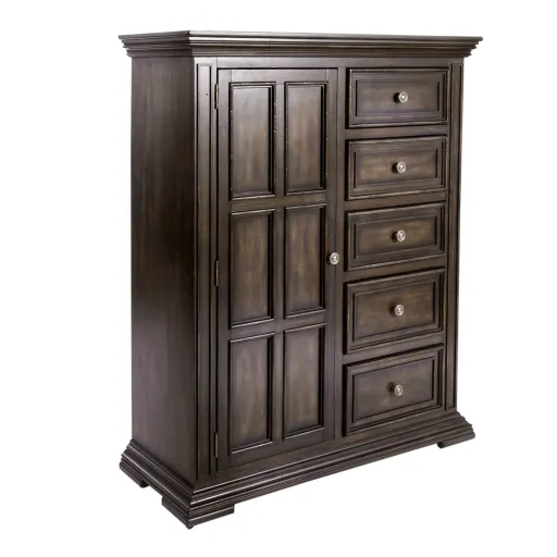 Bring high quality style to your bedroom with this relaxed vintage door chest. Thanks to its wood molding, distressed finish, and antique-like metal hardware, this piece is sure to warm up your decor with its classic look. Plus, its adjustable shelving makes it perfect for all kinds of storage.