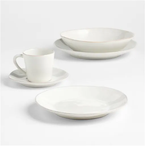Artisanal ceramic shapes are glazed a soft white with subtle hand-antiquing on the freeform rims. The unique form suits organic modern tables and is plenty chic for elegant occasions, while the durable stoneware is sturdy enough for use every day. Microwave-safe and oven-safe up to 300°F, our Marin place setting is also dishwasher-safe for easy cleanup after meals. This set, a Crate and Barrel exclusive, includes a dinner plate, a salad plate, a low bowl, a cup and a saucer. To set a coordinated table, add our Marin serving pieces. Due to their handcrafted nature, each piece will be slightly unique.