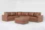Transform your living space with the Alicia Saddle Brown Vegan Faux Leather 140" 4 Piece Sectional & Ottoman. This casual sectional offers a comfortable and spacious seating solution, perfect for family gatherings or lounging. The rich saddle brown color adds a warm and inviting touch to any room.