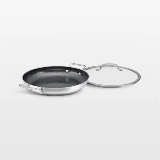 Cuisinart's FushionPlus cookware lets you sear, saute and brown with chef-worthy results. The everyday pan is ideal for cooking larger cuts of meat, stir-fries and stews. An aluminum core ensures quick and even heating, while PurelySear ceramic non-stick technology delivers the perfect searing of stainless steel along with the easy-release of non-stick ceramic. For added durability, the Armorguard interior layers a stainless steel grid on the cooking surface to protect the non-stick ceramic coating underneath. Rimmed in stainless steel, the tempered glass lid seals in juices while providing a peek at the cooking progress.