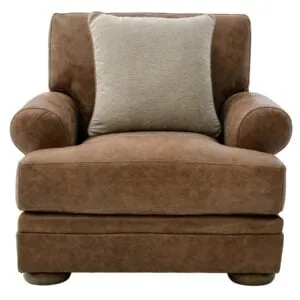 Upholstered in a tawny brown top-grain leather, this chair features a plump back and seat cushion, padded rolled arms, a coordinating toss pillow, stitched accents, tailored base, and bun feet in a tan finish.