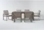 Experience the perfect blend of style and functionality with the Malaga II Natural Wood Rectangle Metal 80" Outdoor Dining Table and Arm Chairs Set for 6. Designed with a modern aesthetic, this dining set is constructed from 100% eucalyptus wood, offering both durability and weather resistance. The weathered grey finish adds a soft, neutral tone to your outdoor space, making it ideal for gatherings and family meals.