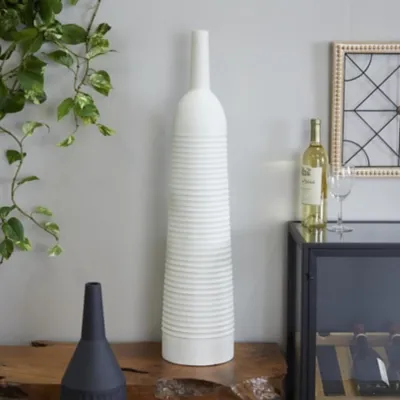 Enhance your entryway or living room with this white centerpiece vase, adding a touch of elegance next to a console table. Designed with felt or rubber stoppers at the base that prevent scratching furniture and table tops, as well as sliding around. This item ships in 1 carton. Suitable for indoor use only. This item ships fully assembled in one piece. This is a single white colored vase. Modern style. Vase has a 1.50 in mouth opening.