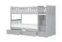 Introducing the Kory Grey Wood Twin Over Twin Bunk Bed with Reversible Stairway Chest and Underbed Storage Boxes. This traditional bunk bed is perfect for kids' rooms, offering ample storage and a neutral grey finish. Made from solid pine wood, it combines durability with a classic design.