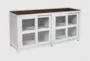 Introducing the Donan Farmhouse White + Brown 2 Tone Wood 4 Door Glass 68" Sideboard Buffet, a perfect addition to your dining room or living room. This sideboard buffet combines a rustic farmhouse style with a timeless design, featuring mystic brown and white tones that complement any home decor. Made with pine solids and veneer, it offers both durability and charm.
