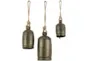 Create a sense of balance and depth in the most unique way by hanging these bells in empty spaces needing some extra love. Bell decor set is stunning year round, but provides the added benefit of transitioning to holiday decor when the season is near. Add charming appeal to your home and hang these decorative cow bells in a doorway or hallway corner, or get creative and layer from tree branches for added visual flair. This item ships in 1 carton. Iron decorative cow bell makes a great gift for any occasion. Can be hung vertically using the jute rope; nails and screws not included. Suitable for indoor use only. This item ships fully assembled in one piece. Made in India. This bronze colored meditation bell comes as a set of 3. Rustic style.