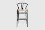 Introducing the Black Wood Wishbone 30" Barstool with Natural Seat and Back, designed in a modern style that adds a touch of sophistication to any dining room or kitchen. The barstool features a sleek black finish and is constructed from solid birch wood, ensuring durability and stability. With a semi-circle shape and armless design, this barstool is perfect for small spaces while providing comfortable seating.
