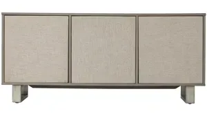 Giovanna Media Console optimize your storage space with this three-door media center. Linen-covered doors bring textural warmth and casual elegance to your living room or den, while the antiqued silver base and curved design anchor the classic look. Three cabinets with adjustable shelves conceal games, movies, and consoles, keeping your entertainment space organized. Bring back movie night when you add this small space media console to your game room or open concept living space.