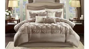 Update your entire space instantly with the Jelena 24-pc. Room in a Bag. The bold red base on this comforter works beautifully with the soft white and red piecing. Decorative embroidery adorns the bottom portion of this comforter and the center of each sham creating a rich look in your space. Four solid red window panels, four taupe tie backs and two embroidered valances accompany your new bedding for a whole room makeover. Four embroidered decorative pillows, two shams and a bedskirt put the finishing touches on this complete look.