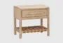 The Skylar Brown Wood 1-Drawer Nightstand with USB in granola is a modern addition to your bedroom. Featuring a woven design and crafted from acacia wood, this nightstand combines functionality and style. With a convenient USB port, it ensures your devices stay charged while you rest.