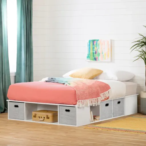 This Queen Bed Frame with storage and baskets has a unique design catering to style and functionality. Enjoy this innovative bed and all its storage compartments that entail. Mix and match according to your style- alternate between open space and the included storage bins. Creating storage out of otherwise unused space makes this bed the perfect solution for small spaces. This bed's clean design will match any furniture or décor. With several compartments available, storage options are endless! Mix and match the provided storage bins with baskets, and stack books or pillows in between. Available for Online Purchase Only. Assembly required. This product ships direct from the manufacturer, so RC Willey Delivery is not available.