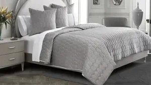 If you love embroidered details and velvety fabrics, the Affluent 4-pc. Quilt Set is the perfect layering piece or alternative bed cover for you! The elongated diamond pattern pairs effortlessly with existing styles and d_cor, while the soft dove gray polyester velvet adds a soft, luxurious touch. Included is 1 quilt and 3 euro shams.