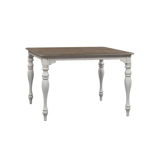 Sitting pretty with the Magnolia Manor optional five-piece gathering table set, consisting of four spindle back counter chairs and a gathering table. Crafted of poplar solids and white oak birch veneers, this kit features an antique white finish with a weathered brown top with whitewash. The table offers one 18-inch removeable leaf, to accommodate guests or a larger family, a fancy face dining top and heavy turned legs. The counter chairs showcase the perfect blend of European design with nylon chair glides to protect your flooring, and a spindle back with wooden saddle seat, anchored by beautifully turned legs. Warm antique finishes and artistic distressing along with grand scale create a piece to be passed to generations.